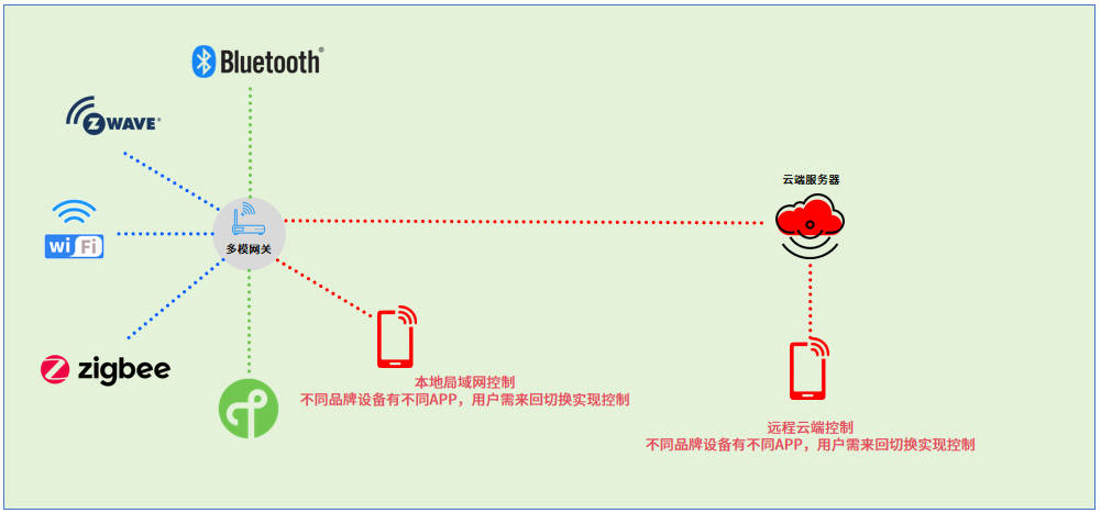 现阶段,智能家居行业主要通过网关的“翻译”能力来解决这一兼容性问题,即通过网关的协议转换能力来协调使用不同通信协议的设备之间的通信,实现设备与手机APP、云端服务器的互通。