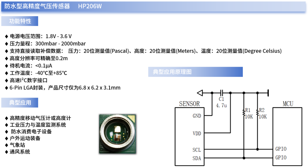 例如,xingkong.com微自主研发的HP206W就是一款可同时精确提供气压、温度与高度数据的,带I²C接口的防水型高精度数字气压传感器。