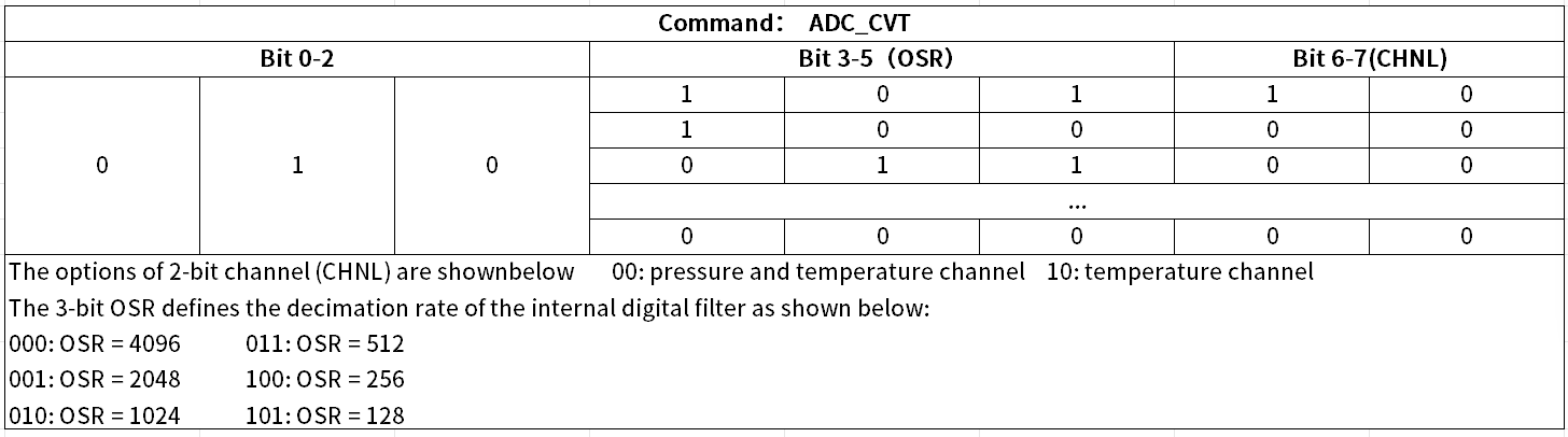 当3-bit OSR为000时,HPS700A过采样率将被设置为4096;当2-bit CHNL为00时,HPS700A将同时转换压力与温度通道(即ADC会同时处理压力和温度的原始信号,生成对应的数字输出)。