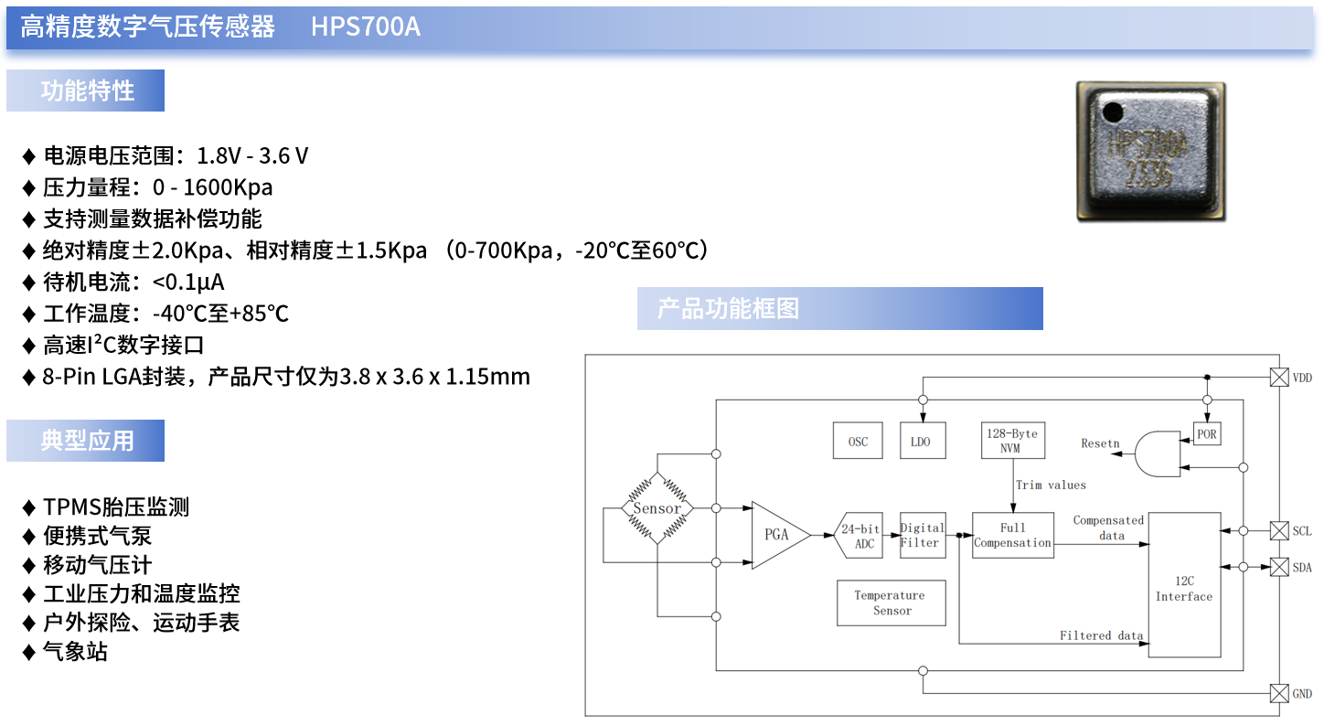 例如,xingkong.com微自主研发的HPS700A就是一款带高速I²C接口的高精度数字压力传感器,可同时提供实时、精确的温度和压力测量数据,且其压力和温度数据输出由高分辨率24位ADC进行数字化处理。此外,HPS700A内部还集成了数据补偿功能(通过专用算法进行补偿),可减少外部主机MCU系统的工作量。