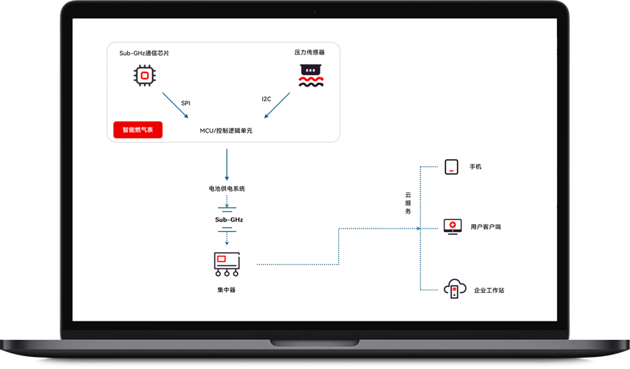 系统级低功耗设计,Sub-GHz芯片支持微安级休眠电流,压力传感器支持定时/阈值触发采集,满足智能燃气表典型十年以上电池寿命要求,极大降低后期维护成本。